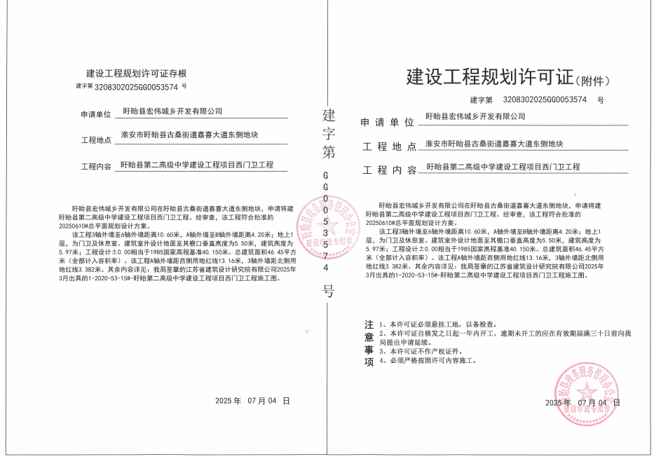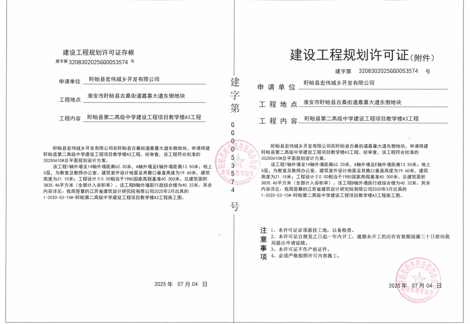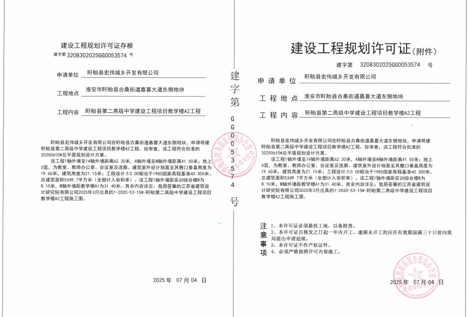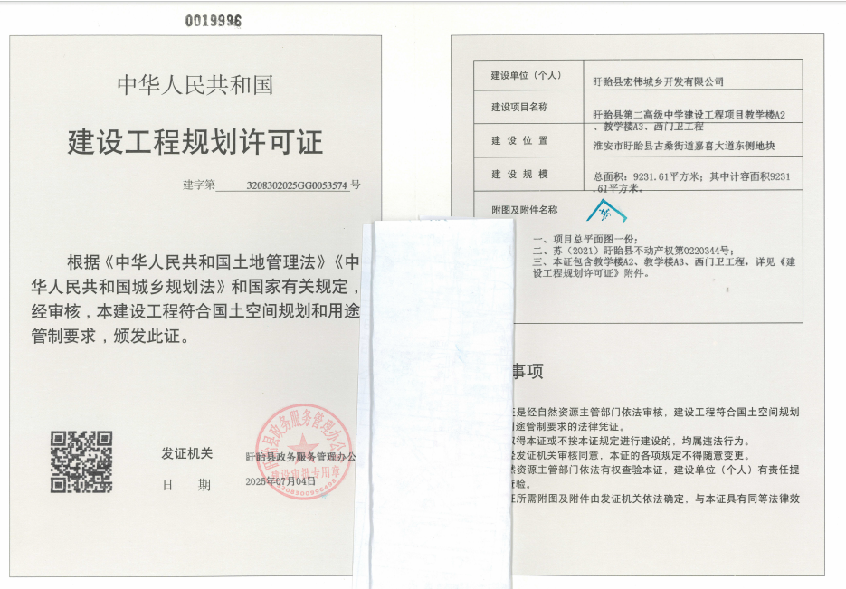 关于盱眙第二高级中学工程项目《建设工程规划许可证》的批后公布
