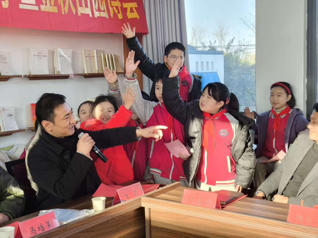 活动伊始,嘉宾们在“果韵田园 古驿马湖”旁观赏了盱眙非遗腰鼓舞。作为承载地方记忆的驿道遗存,此处纳入活动场景,正是江苏“读城行动”向乡村延伸的生动实践,让乡村文脉在“读村史、品古驿”中焕发生机。随后,嘉宾参观《穆店诗草》成果雅集与“凝心聚力促发展”主题展,全方位感受穆店“诗词之乡”的文化底蕴与乡村振兴成效。穆店镇商会、诗词协会分别捐赠《我遥远的青墩》《穆店诗草》本土著作,为文脉传承添力。多位本土诗人分享创作心得,用乡土文字抒发乡愁。亲子诵读环节温情动人,家长与孩子携手登台朗诵《稻田里的中国梦》,稚嫩童声与醇厚乡音交织,将对家乡沃土的眷恋、对丰收的期盼融入诗句,让在场者深切感受到乡土情怀的代代相传。活动中,穆店中心小学教师讲述“唐凤朝与三对父母”的感人事迹,以身边榜样传递优良家风;文史专家马培荣则溯源马湖村历史人文,加深观众的家乡认同感。穿插的三轮全民阅读有奖问答,激发观众参与热情,在互动中普及阅读知识。